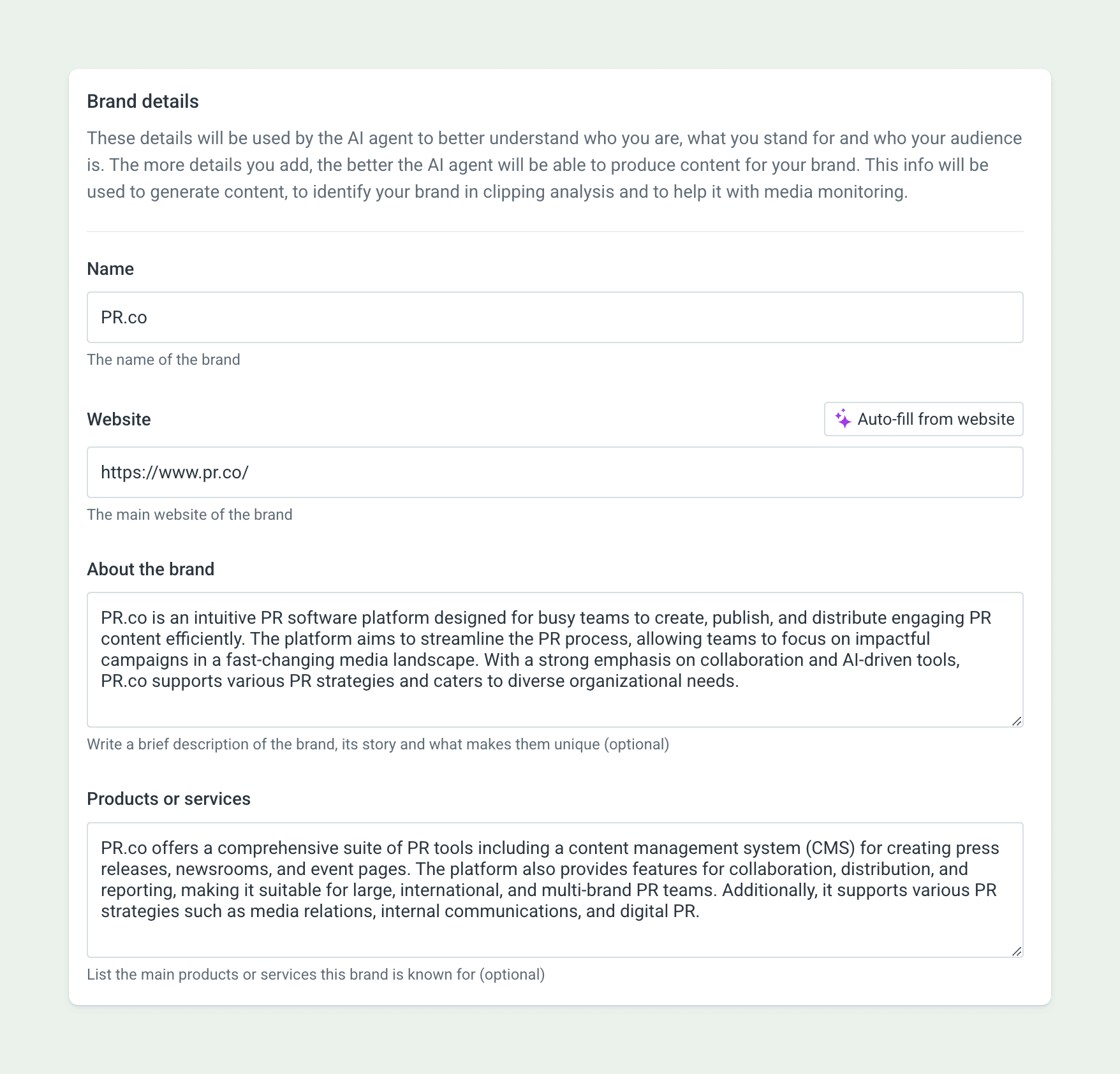 Don't have time to fill it all in yourself? No worries. You can let our AI Agent take care of it for you instead. Just click “Auto-fill from website” to have the AI Agent pull information from your site automatically, analyze it, and do a best-effort attempt at filling-in your tone-of-voice and other fields for you. All that's left is for your to review, make the final edits, and you’re done.