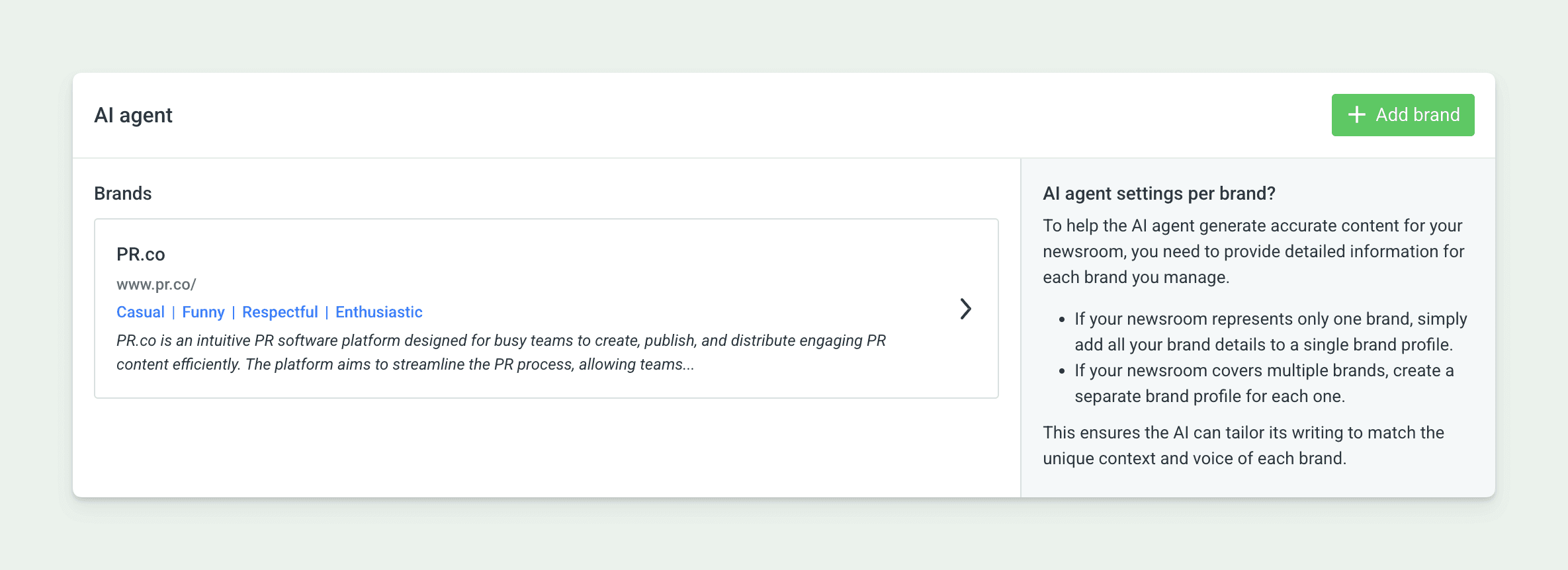 The more context you add, the less editing you'll need to do. Brand details combine with your Brand voice settings so that AI Agent generates content that sounds like your team wrote it.