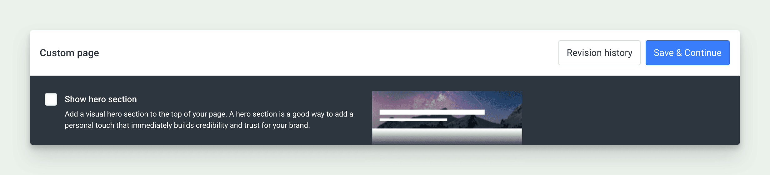 Every page can include a hero section — a visual header with background image, title, and subtitle that makes a strong first impression.