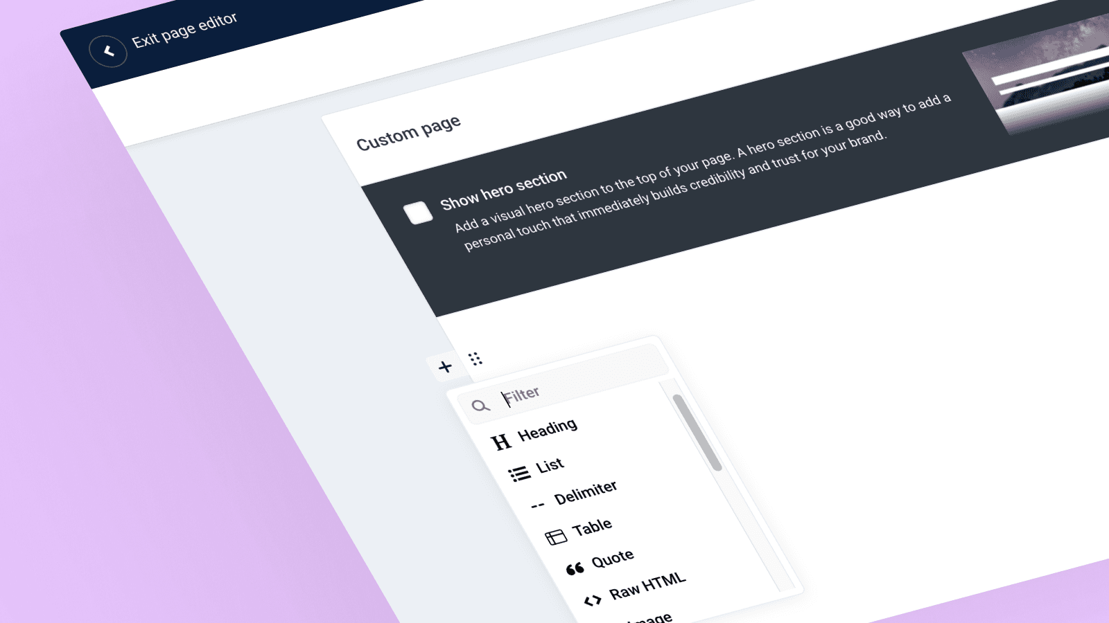 Build your page using our Page Editor. Pick blocks from the menu on the left, click to add them to your page, and then add your content directly. Stack and arrange blocks however you want. We handle the styling and make sure everything looks good.