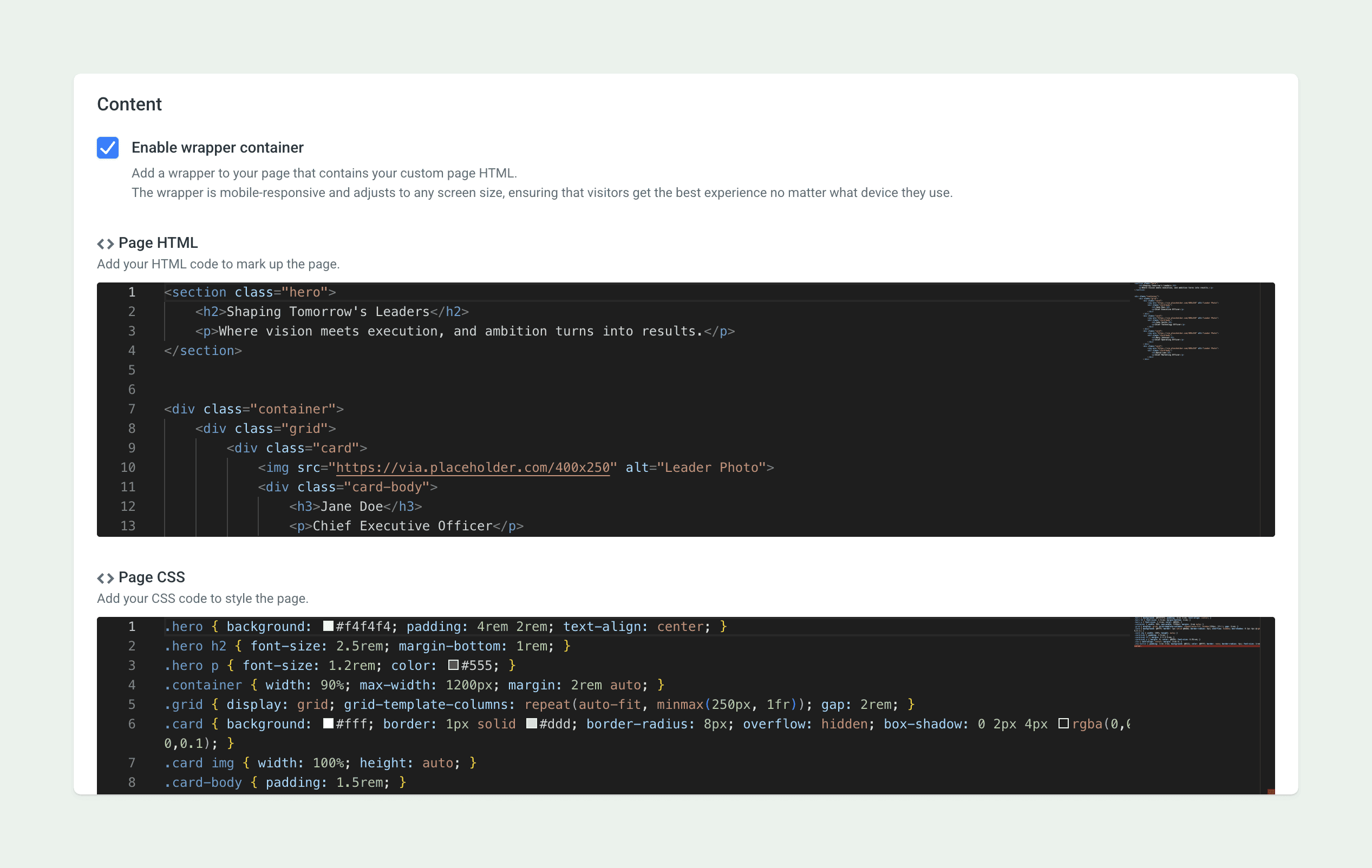 For teams with specific design needs or technical skills, use our custom page editor. Write HTML, CSS, and JavaScript to build exactly what you want. With this approach, the only limit is your imagination.